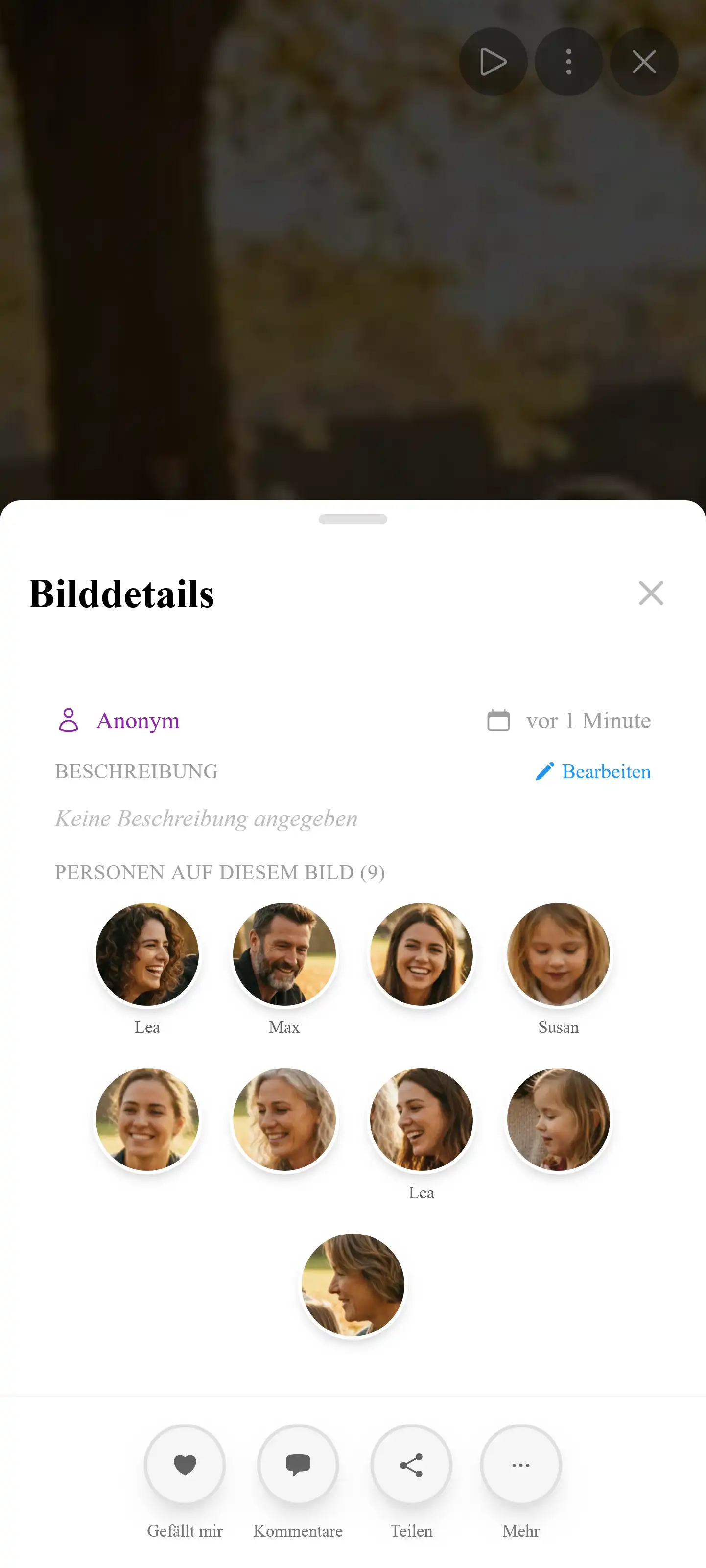 Admins können Gesichtsclustern Namen zuweisen. Sobald ein Cluster mit dem Namen einer Person versehen ist (z. B. „Sarah Müller“ oder „Onkel Hans“), erscheint dieser Name beim Durchblättern der Gesichtsgalerie. Das erleichtert das Finden bestimmter Personen und verleiht der Galerie eine persönliche Note. Benannte Cluster verbessern auch die Nützlichkeit der Download-Funktion — Gäste können nach Personen suchen und alle Fotos mit ihnen herunterladen.